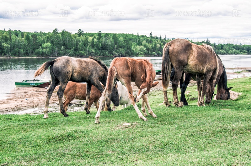 Табун лошадей свободно пасется снаружи, лошадь пьет воду из реки