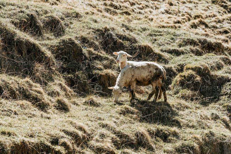 Стадо горных овец пасется на холмистом зеленом лугу, сельскохозяйственные животные гуляют