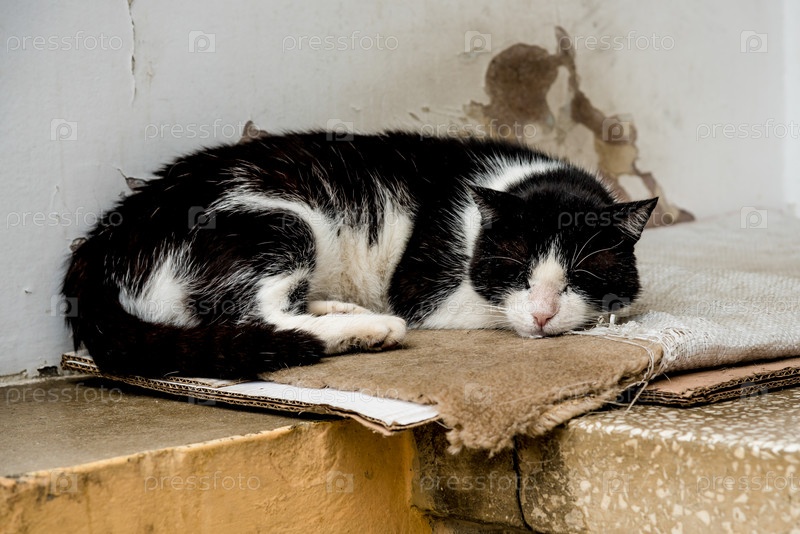 Уличный бездомный милый пушистый кот отдыхает за пределами городского пространства