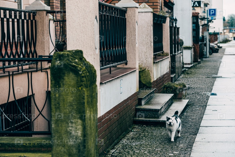Уличный бездомный милый пушистый кот отдыхает за пределами городского пространства
