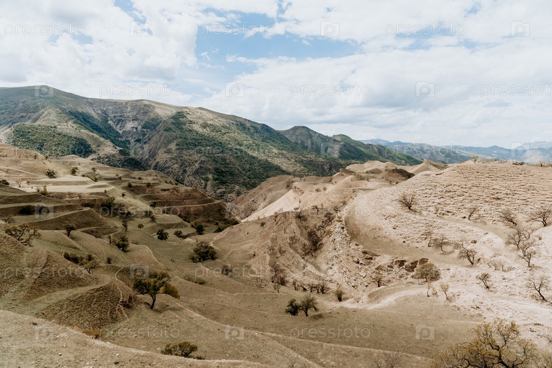 Пейзаж гор Дагестана, горный хребет в дымке лета