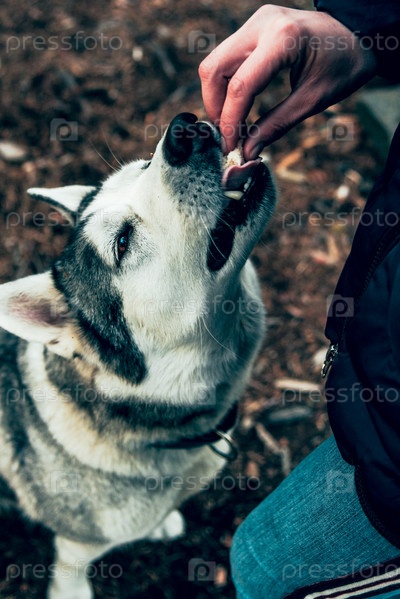 Милая пушистая собака породы хаски в походе на пикник, хозяин кормит питомца