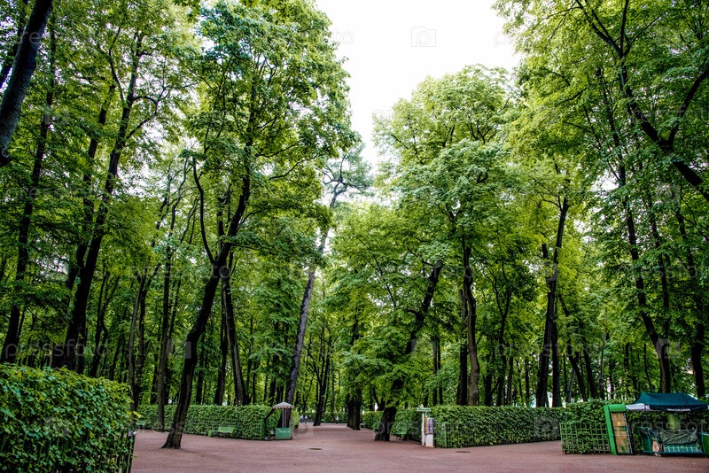 Зеленый городской парк с пешеходными дорожками, тропа рядом с зеленой изгородью, пасмурный день, Летний сад, Санкт-Петербург, Россия