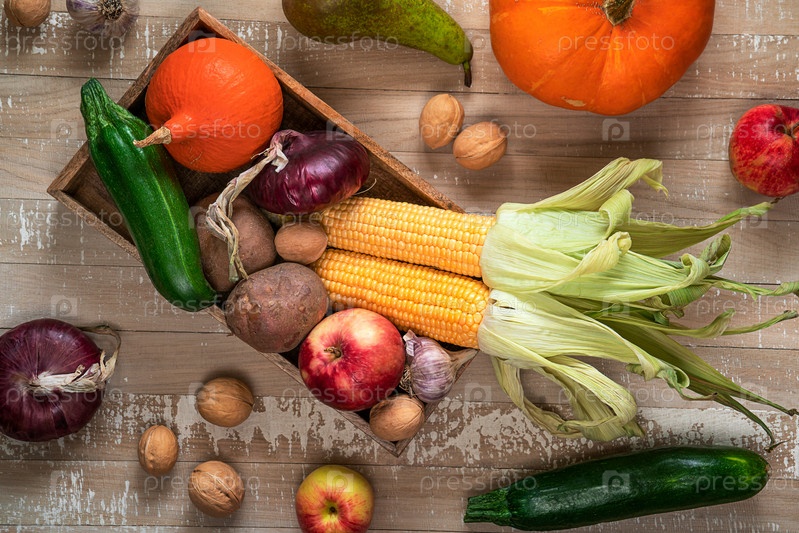 Овощи и фрукты в коробке. Вид сверху на деревянный ящик с кукурузой, тыквой, яблоками, орехами, луком, картофелем, чесноком, цуккини, морковью, грушей