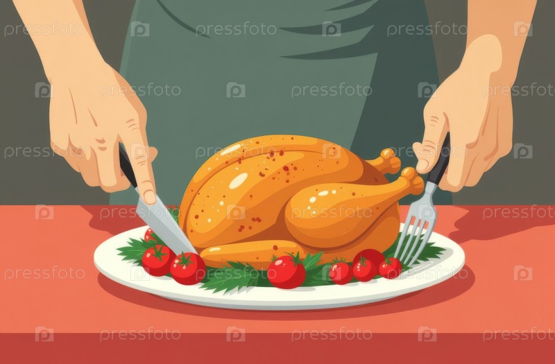 Целая жареная курица на тарелке, люди режут праздничное блюдо из индейки
