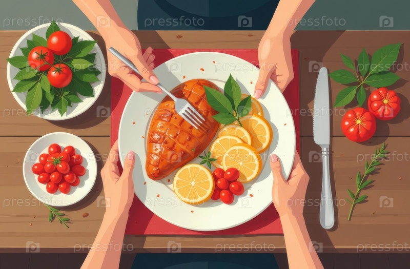 Романтический ужин на двоих, бизнес-ланч мясное блюдо, вид с высоты птичьего полета