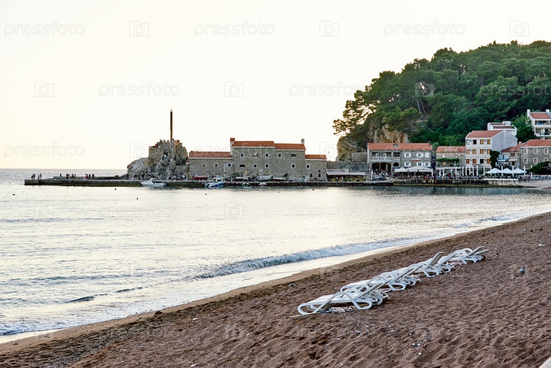 Песчаный желтый пляж на фоне моря, волны океана в песке Черногория Петровац