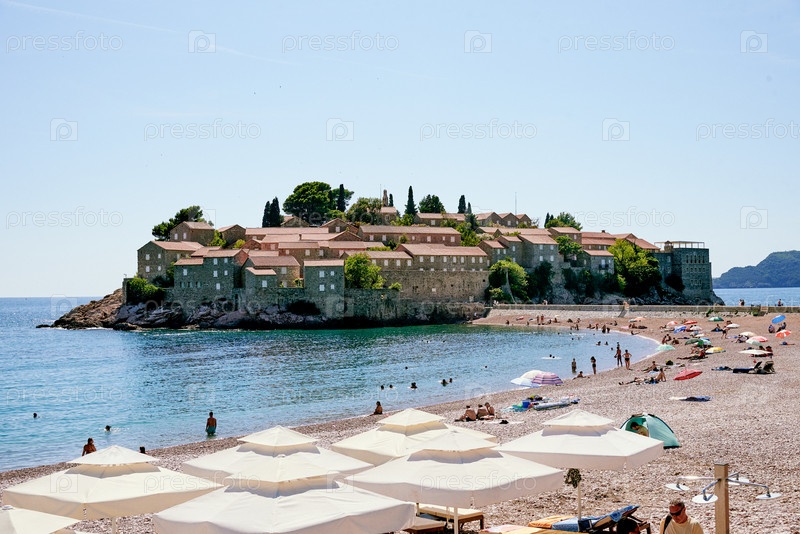 Песчаный желтый пляж на фоне моря, волны океана в песке Черногория Свети Стефан