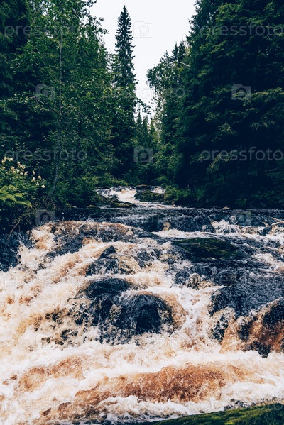 Пейзаж реки среди камней, быстрое течение воды в водохранилище при свете дня Карелия Россия