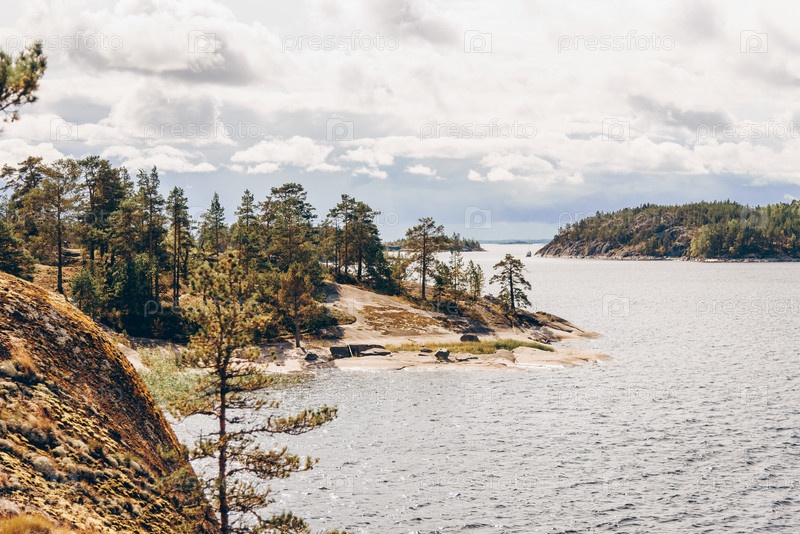 Пейзаж синего глубокого озера в свете солнца днем, облака в небе Ладожские шхеры Карелия