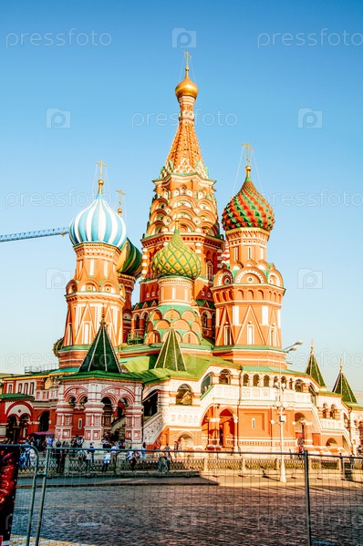 Москва, Россия, 24 августа 2015 г., Храм Василия Блаженного с куполом и христианским крестом, Культовое сооружение верующие для молитв