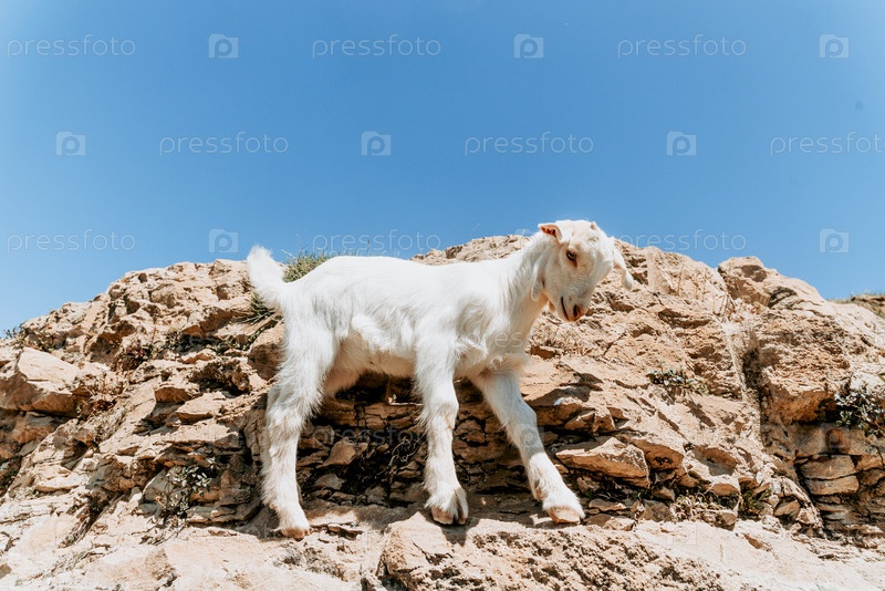 Детеныши горного козла пасутся на улице — милые животные на ферме