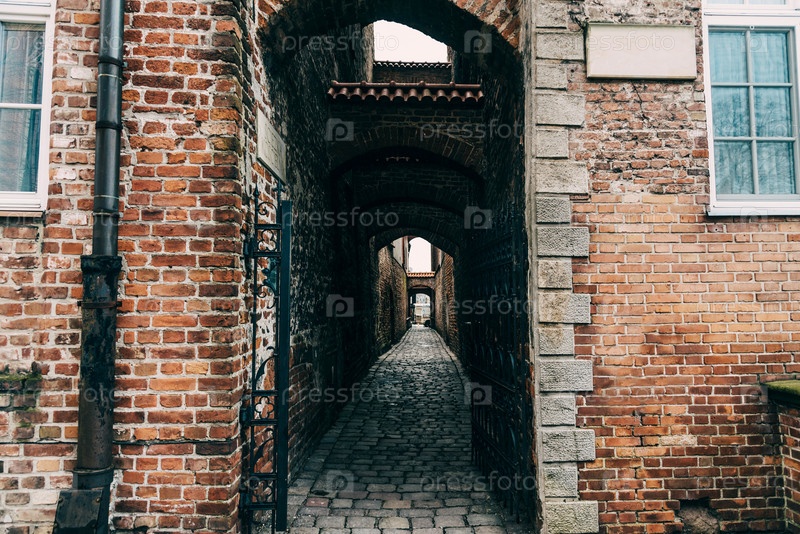 Проходная арка, коридор между улицами внутри кирпичного жилого дома