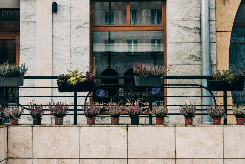 Украшенный цветами и растениями в горшках балкон жилого дома