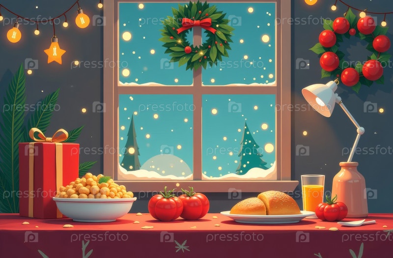Рождественский ужин, еда на тарелке на столе, фон в виде рождественской елки