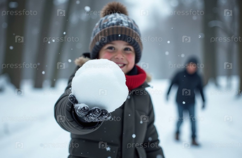Мальчик держит снежок в руке, дети играют в снежки на улице в лесу