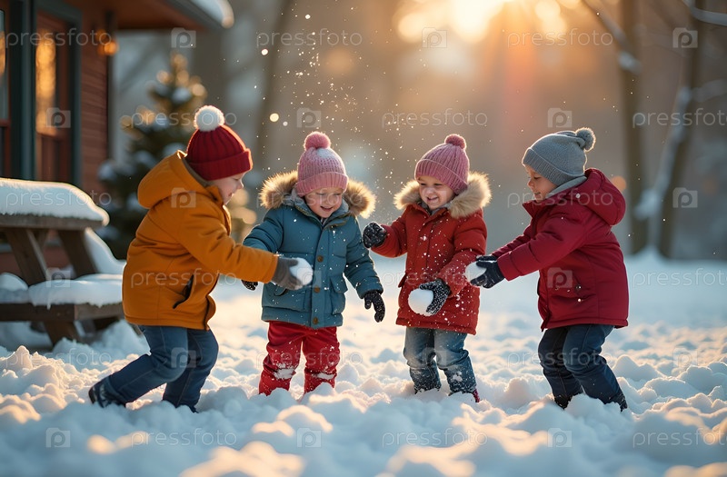 Дети играют в снежки на улице, яркий зимний день
