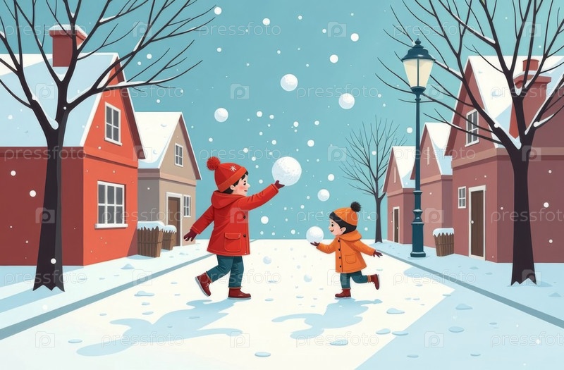 Дети играют в снежки на улице, день, зима, иллюстрация, открытка
