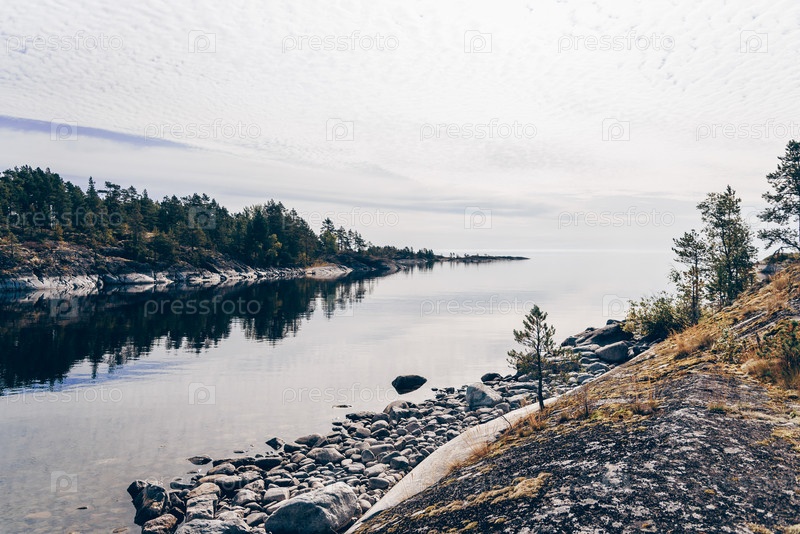 Пейзаж синего глубокого озера в свете солнца днем, облака в небе Ладожские шхеры Карелия