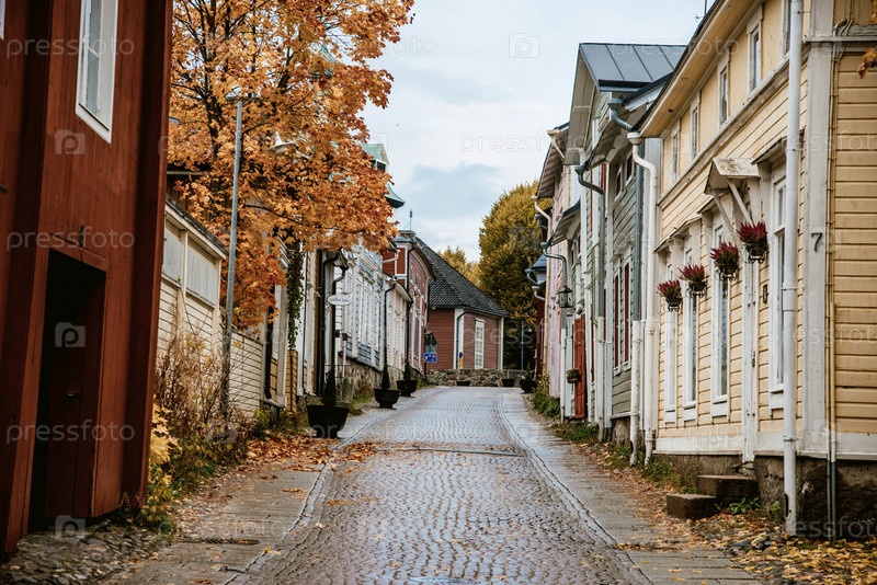 Порвоо, Финляндия, октябрь 2019 г., Городская улица в пасмурный дождливый день, заброшенный маленький городок в осенний день