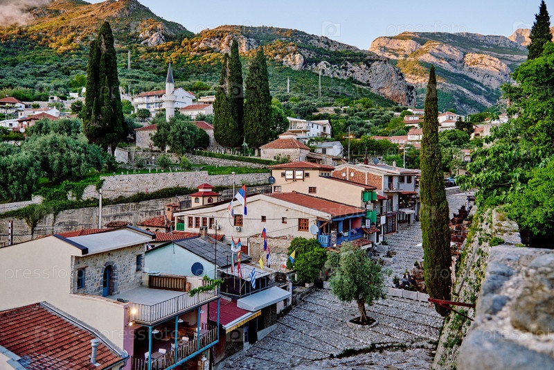Бар, Черногория, Старая часть города находится в горах, каменные здания и дома построены на холме, на фоне горы