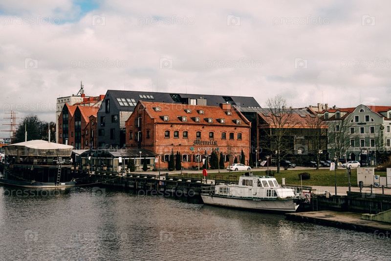 Клайпеда, Литва, февраль 2019 г., Городская улица в пасмурный дождливый день, заброшенный маленький городок в осенний день