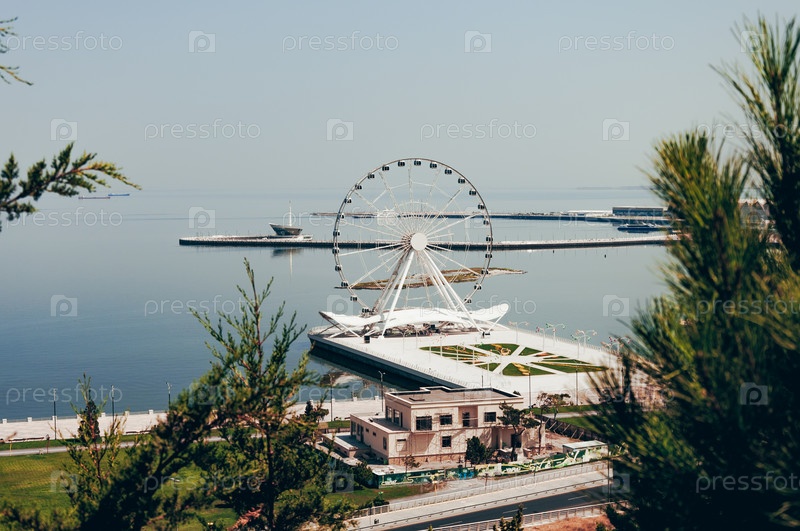 Баку, Азербайджан, август 2016 г. Вид на набережную Каспийского моря и колесо обозрения