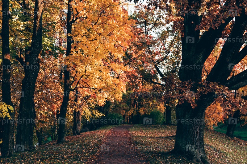 Зеленый городской парк с пешеходными дорожками, тропа рядом с зеленой изгородью, пасмурный день, Гатчинский сад, Санкт-Петербург, Россия