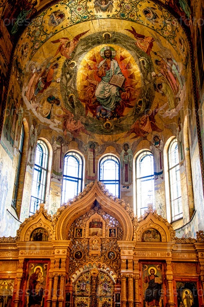Санкт-Петербург, Россия, 1 августа 2015 г., Православная церковь Спаса на Крови с куполом и христианским крестом, культовое сооружение верующие за молитвами, внутренняя роспись