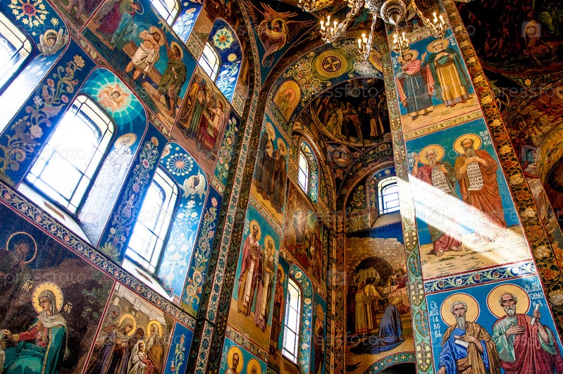 Санкт-Петербург, Россия, 1 августа 2015 г., Православная церковь Спаса на Крови с куполом и христианским крестом, культовое сооружение верующие за молитвами, внутренняя роспись