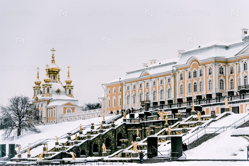 Петергоф, Санкт-Петербург, Россия, 18 февраля 2018 г., музейный комплекс с дворцом и каскадным фонтаном