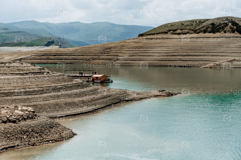 Пейзаж синего глубокого озера в свете, облака в небе, горы Дагестан Россия