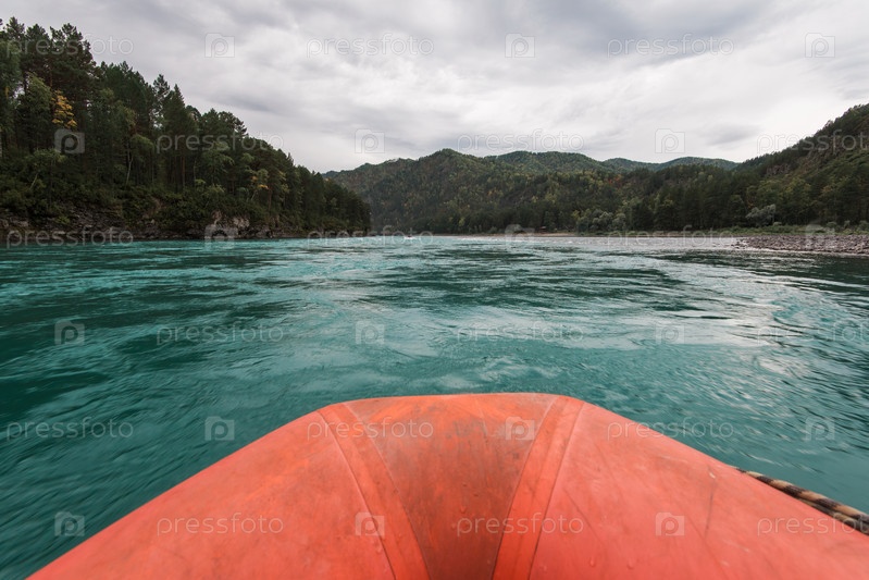 Сплав на плотах и лодках по реке Катунь на Алтае в России. Вид от первого лица