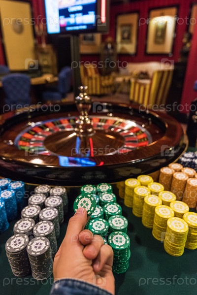 Казино, азартные игры и развлекательная концепция - стол для рулетки и стопка фишек для покера