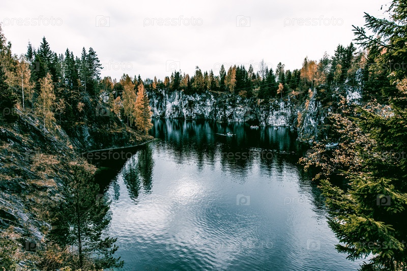 Пейзаж синего глубокого озера в свете солнца днем, облака в небе Рускеала Карелия Россия
