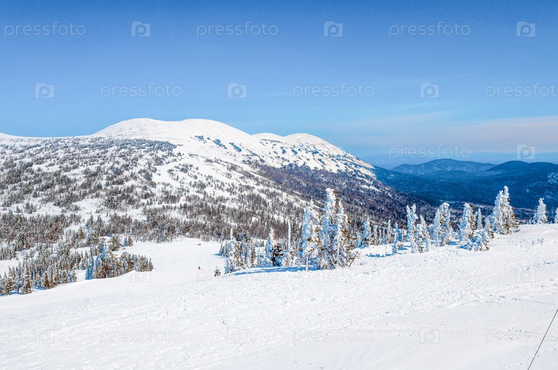 Пейзаж заснеженных гор Шерегеша, горный хребет в дымке зимы