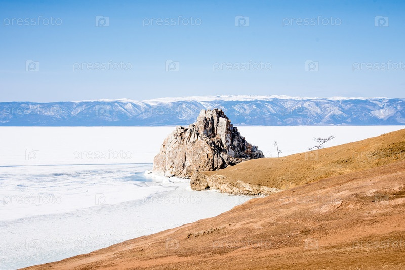 Пейзаж глубокого озера с голубым льдом в свете солнца днем, облака в небе Байкал Сибирь Россия зима скала Шаманка