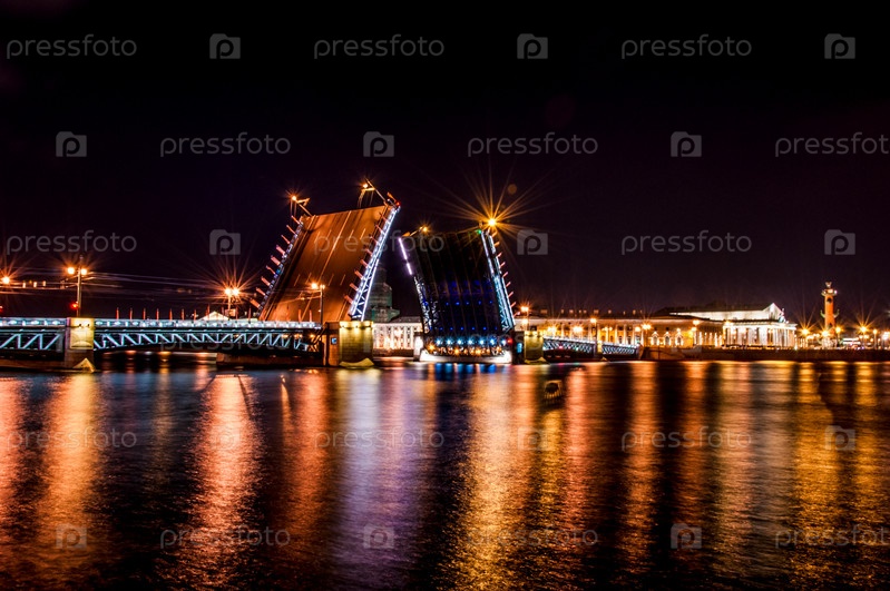 Дворцовый мост открыт на ночь через реку Неву, Санкт-Петербург, Россия