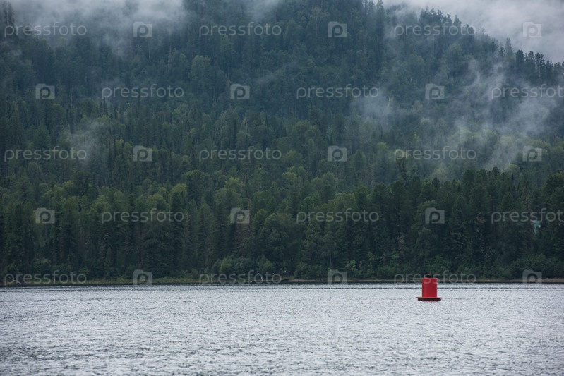 Телецкое озеро в горах Алтая, Сибирь, Россия. Туманное летнее утро