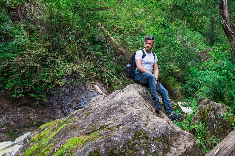Человек-путешественник с рюкзаком сидит на скале в лесу. Концепция образа жизни или приключенческого отпуска