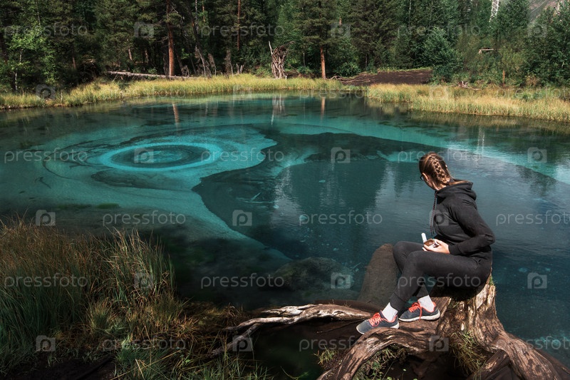Женщина у прекрасного гейзерного озера с термальными источниками, которые периодически выбрасывают из земли голубую глину и ил. Алтайские горы, Россия