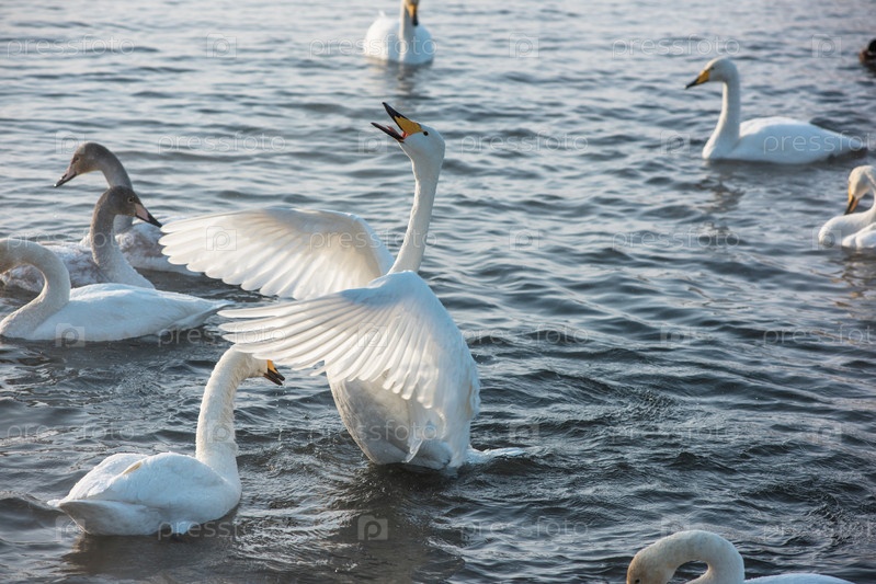 Лебеди-кликуны плавают в озере, Алтай, Россия