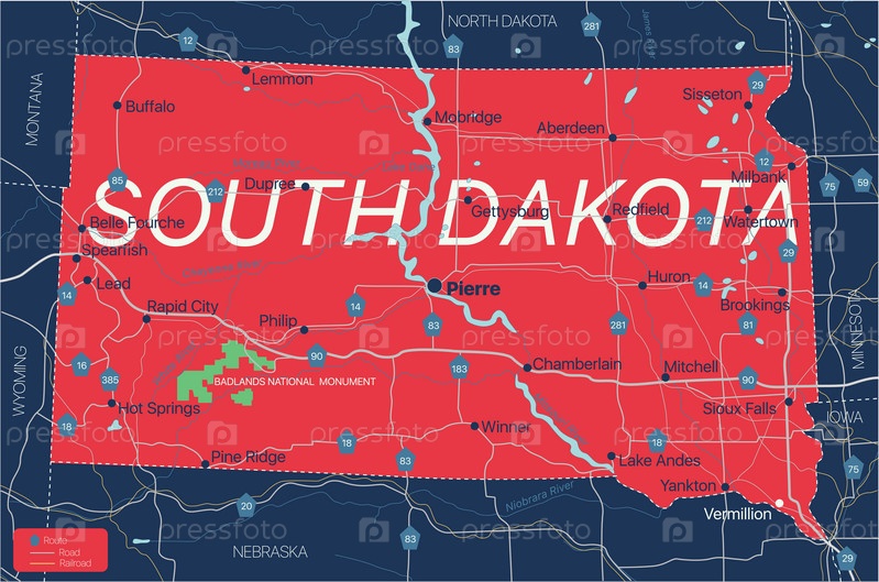 Подробная редактируемая карта штата Южная Дакота с городами и поселениями, географическими объектами, дорогами, железными дорогами, межштатными и автомагистралями США. векторный файл EPS-10, трендовая цветовая схема