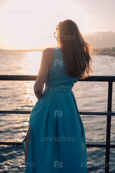 Женщина в развевающемся платье на пирсе у моря