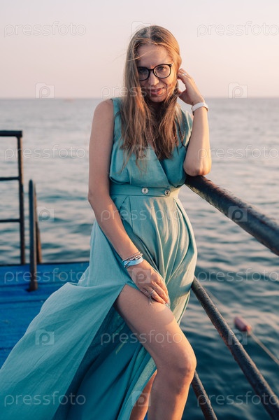 Женщина в развевающемся платье на пирсе у моря