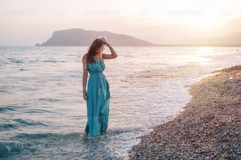 Женщина в развевающемся платье на пирсе у моря