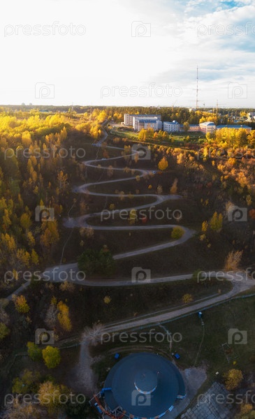 Вид сверху на извилистую дорогу в городе, снято с дрона. Барнаул, Сибирь, Россия. Красота осеннего дня