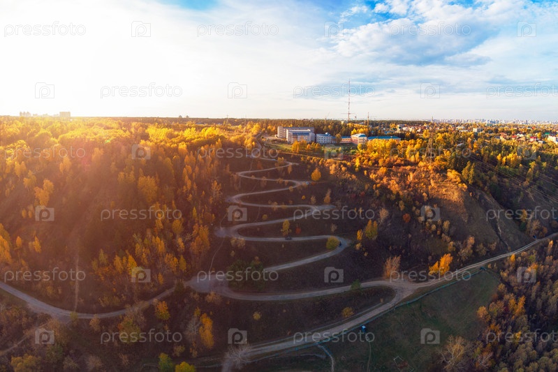 Вид сверху на извилистую дорогу в городе, снято с дрона. Барнаул, Сибирь, Россия. Красота осеннего дня