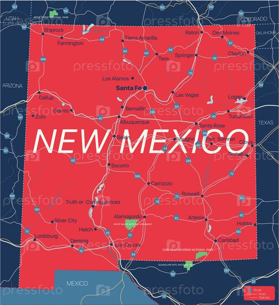 Подробная редактируемая карта штата Нью-Мексико с городами и поселениями, географическими объектами, дорогами, железными дорогами, межштатными и автомагистралями США. векторный файл EPS-10, трендовая цветовая схема
