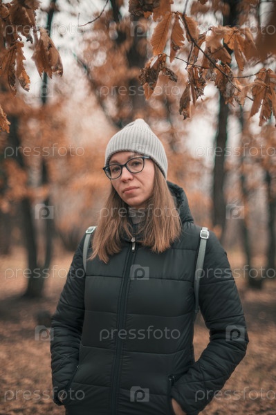 Женщина в теплой одежде в осеннем лесу